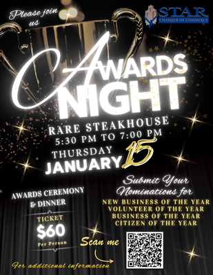 The Star Chamber of Commerce is thrilled to announce that nominations are now open for our 2025 Annual Awards! This is your opportunity to recognize the individuals, businesses, and organizations that have made a significant impact on our community over the past year. From leadership and innovation to volunteerism and community service, these awards honor those who go above and beyond to make our community thrive.