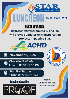 Join the Star Chamber of Commerce on Thursday, November 6, 2025, for our monthly luncheon. Representatives from ACHD and ITD will provide updates on transportation projects impacting Star.